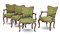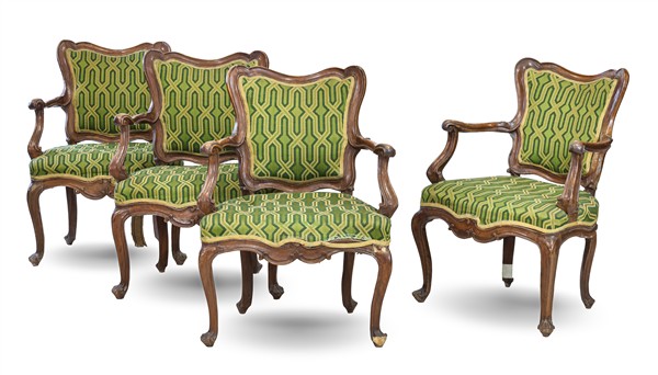 Gruppo di quattro poltrone in noce con schienale sagomato e braccioli terminanti a ricciolo, gambe mosse. Secolo XVIII. Sedute e schienali imbottiti e rivestiti in tessuto operato nei toni del verde (difetti)