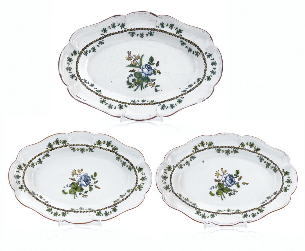 UNA COPPIA DI PIATTI OVALI E UN PIATTO OVALE IN MAIOLICA, NAPOLI, XVIII SECOLO, profili polilobati, decoro policromo centrato da mazzetto di fiori e bordo ad ovuli con festoni ondulati di foglie; uno con lievi sbeccature, tutti recano etichetta di G.Brandi Antichità Napoli.