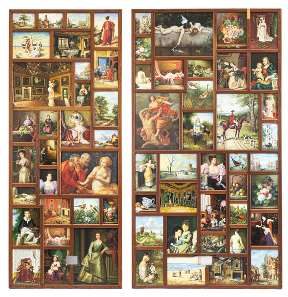 Due pannelli in legno contenenti numerosi dipinti su diverso supporto di sogget