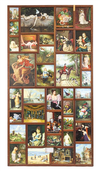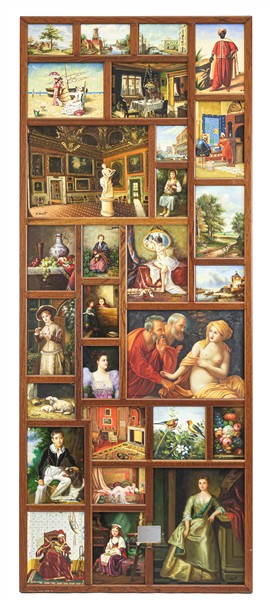 Due pannelli in legno contenenti numerosi dipinti su diverso supporto di soggetto e misure differenti da antichi maestri, alcuni firmati (cm tot 181x97 e cm 180x72,5) (difetti)