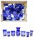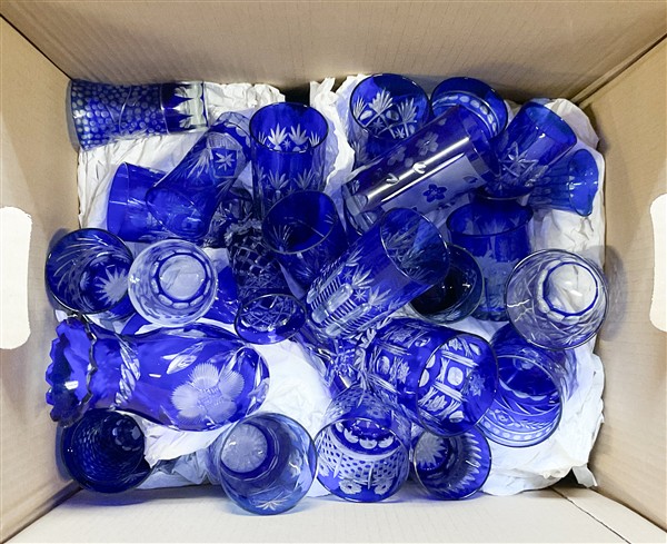 Cartone contente numerosi bicchieri in vetro e cristallo blu e incolore decorat