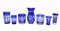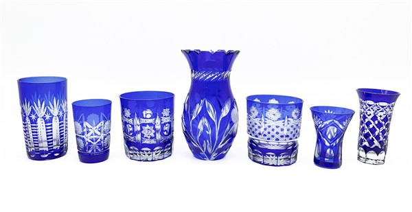 Cartone contente numerosi bicchieri in vetro e cristallo blu e incolore decorati da molature (difetti)