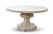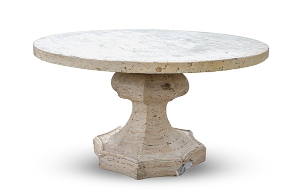 Tavolo in travertino con piano circolare e sostegno costolato rivestito in travertino su base ottagonale (d cm 144, h cm 76) (difetti e rotture)