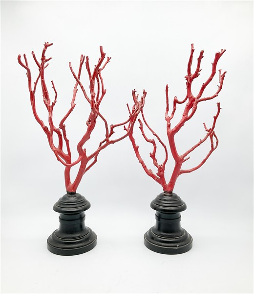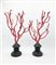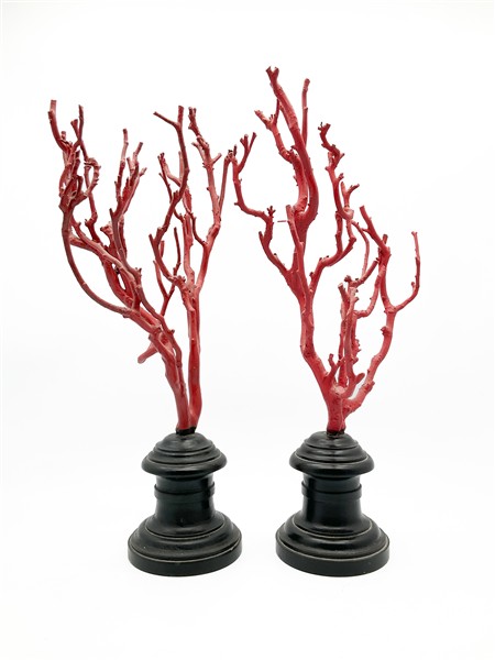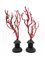 Coppia di rami a finto corallo rosso su base in legno tornito ed ebanizzato (h