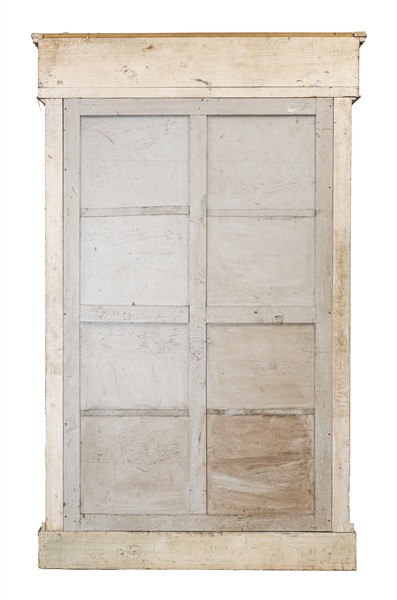 Libreria di gusto neoclassico in legno laccato con decorazione a rilievo in pastiglia bianca a figure, capitelli e candelabra entro riserve, base dipinta a finto marmo (cm 140x236x34) (difetti)