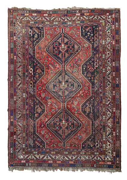 Tappeto Shiraz, Persia, secolo XX. Decoro con tre medaglioni romboidali su camp