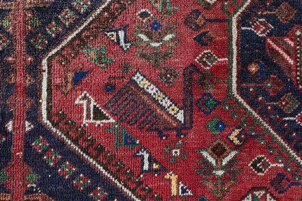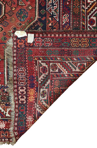 Tappeto Shiraz, Persia, secolo XX. Decoro con tre medaglioni romboidali su campo rosso ornati da motivi floreali stilizzati e pavoni. Bordura principale a meandro su fondo bianco (cm 330x230) (difetti e rapature)