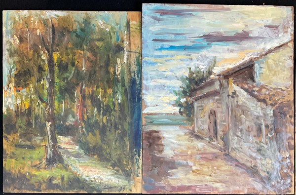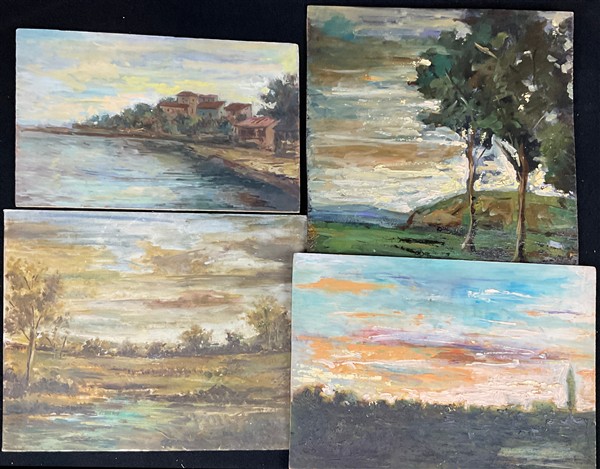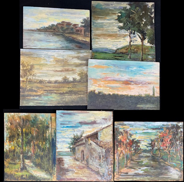Ignoto di inizio secolo XX, lotto composto da numerosi dipinti raffiguranti "Paesaggi" ad olio su diversi supporti, di diverse misure (difetti)