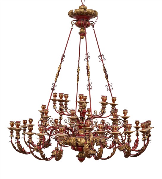 Grande lampadario a quaranta luci su tre file in legno e metallo laccato e dorato, bracci mossi decorati a foglie e volute vegetali (h cm 150, d cm 140) (difetti)