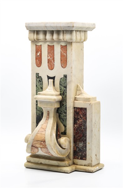 Elemento architettonico in marmo bianco con inserti di marmi policromi diversi, fronte decorato da voluta e base sagomata con baccellature. Secolo XIX (cm 25x53x25) (difetti)