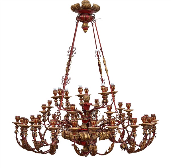 Grande lampadario a quaranta luci su tre file in legno e metallo laccato e dorato, bracci mossi decorati a foglie e volute vegetali (h cm 150, d cm 140) (difetti)