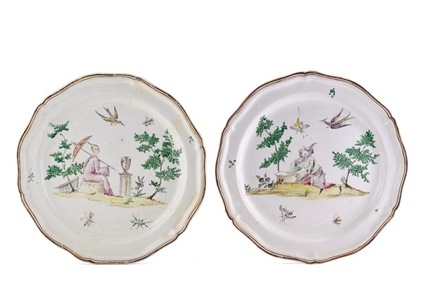 Due piatti a profilo mistilineo in maiolica policroma dipinta con bordo a doppia profilatura in bruno, centrati da figure orientali tra alberi con insetti e volatili sparsi. Al verso recanti la marca "Mil.no" in rosso (d. cm 32) (difetti e un piatto con restauri)