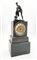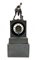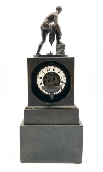 Pendola da appoggio in bronzo brunito a retroproiezione di forma parallelepipeda sormontata da figura mitologica. Quadrante a fascia in vetro con numeri romani, movimento solo tempo a bilanciere sostituito. Base a plinto in legno ebanizzato. Secolo XIX (h. tot cm 41) (difetti e restauri)