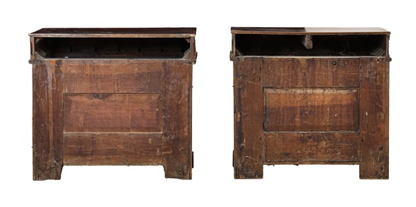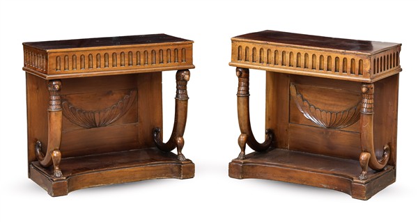 Lotto 1144 | Coppia di mensole da parete in legni vari con fascia unghiata, montanti ad anim