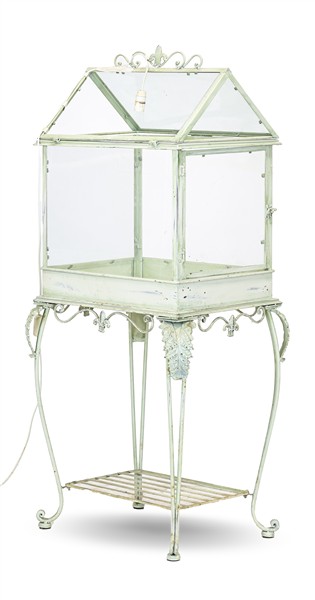 Vetrinetta in metallo smaltato bianco e vetro, gambe mosse riunite da pianetto, parte superiore con tetto a capanna apribile (cm 56x120x45) (difetti e mancanze)