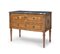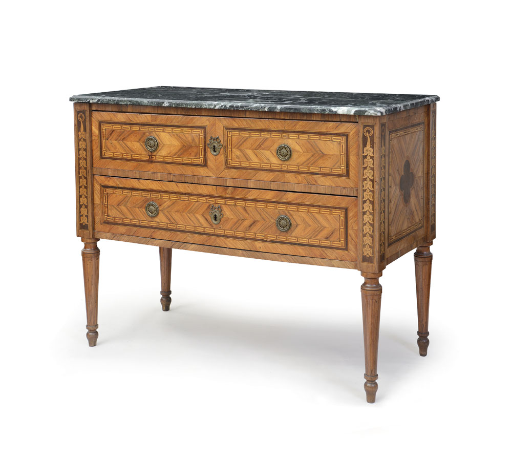 CASSETTONE LUIGI XVI INTARSIATO, TORINO, XVIII SECOLO, a due cassetti con piano in marmo grigio, decori ad intarsio a formare riserve geometriche in legni cari; usure e restauri.