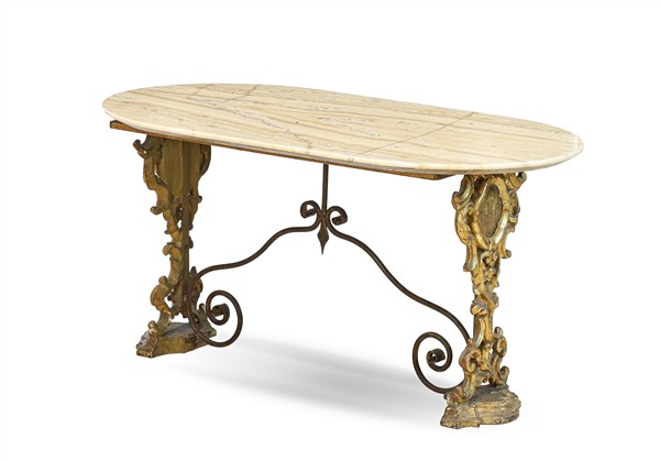 Tavolino da salotto con sostegni ad antichi ostensori in legno intagliato e dorato a mecca e raccordati da traverse in ferro battuto, piano ovale in alabastro (cm 115x56x54) (difetti e restauri)