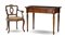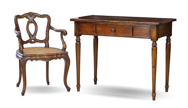 Lotto composto da scrittoio con cassetto sul fronte e gambe tornite (cm 99x78x53) e una poltroncina in stile barocchetto con seduta in paglia di Vienna (difetti)