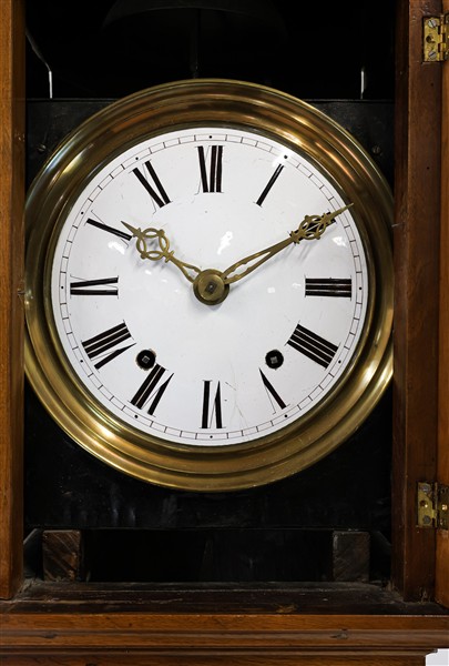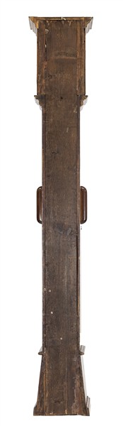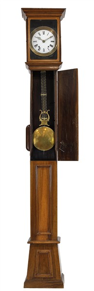 Orologio cassalunga del tipo Morbier con cassa in noce, quadrante in smalto bianco a numeri romani, movimento a due treni con suoneria su campanello. Meccanismo della seconda metà del secolo XIX (h. cm 270) (difetti e cassa adattata)