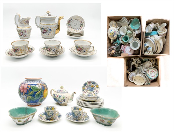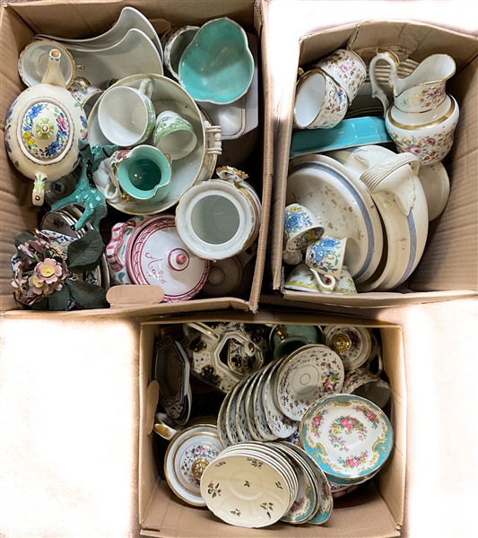 Tre cartoni contenenti numerose ceramiche e porcellane di diversi usi ed epoche (difetti)