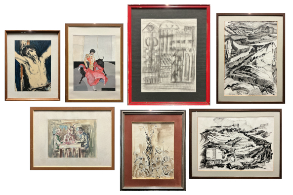 Lotto composto da sette tra tecniche miste e disegni su carta di soggetto, autore e misure diverse (misura max cm 70x50) tutti firmati in basso