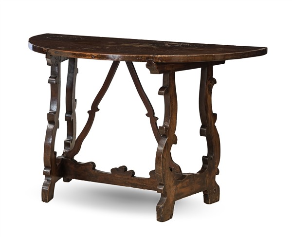 Tavolo da parete con piano a mezza luna tipo fratino con gambe sagomate raccordate da traverse. Mobile realizzato con elementi antichi (cm 131x82x64) (difetti)