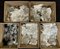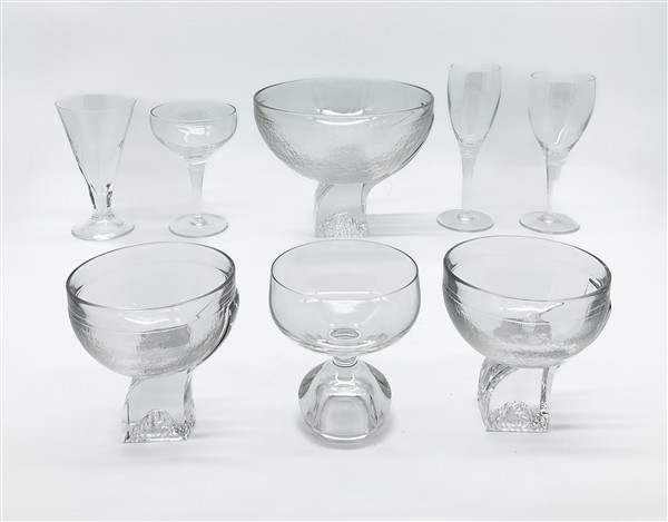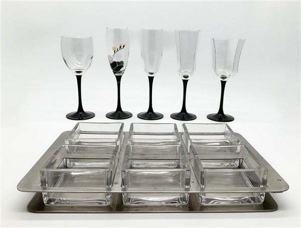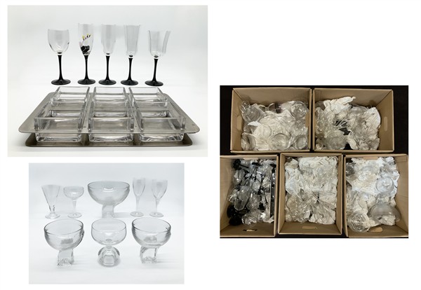 Cinque cartoni contenenti numerosi bicchieri e oggetti in vetro di differenti manifatture e decori diversi (difetti)