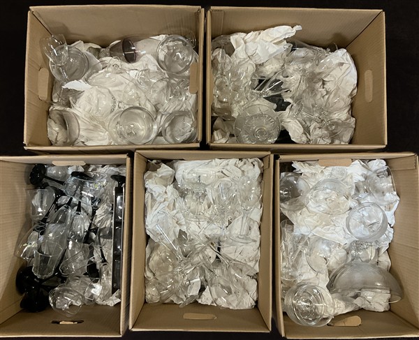 Cinque cartoni contenenti numerosi bicchieri e oggetti in vetro di differenti m