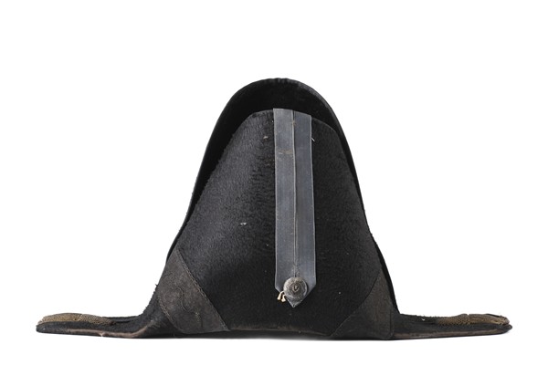 Feluca da Ufficiale delle Guardie Scozzesi in feltro con struttura in cartone pressato, interno rivestito in seta e pergamena. Bottone metallico con motto scozzese dell'Ordine del Cardo "Nemo me impune lacessit". Prima metà secolo XIX (cm 49x25) (difetti e mancanze)