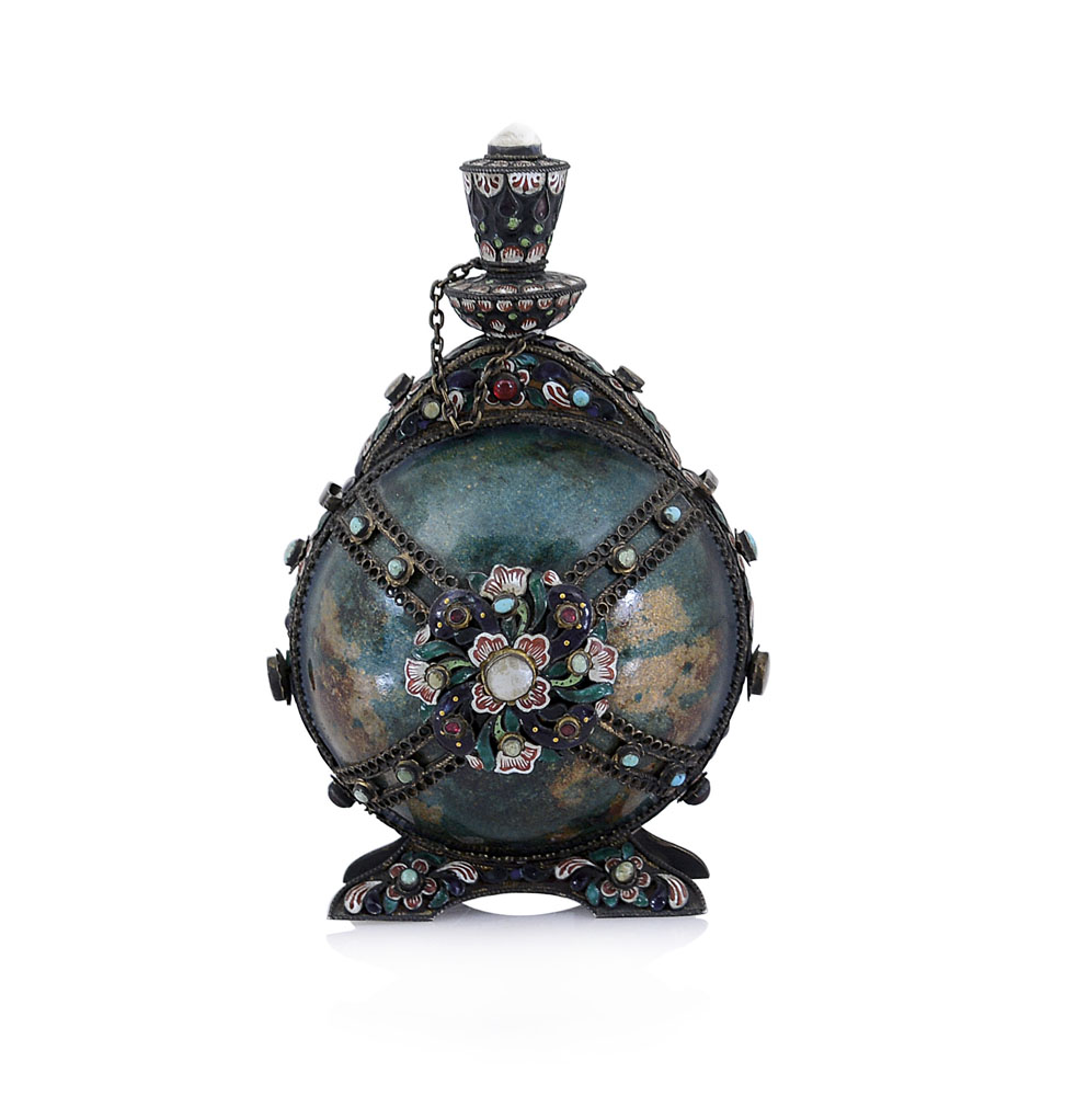 FIASCHETTA CON TAPPO IN ARGENTO DECORATO DA SMALTI E APPLICAZIONI IN PIETRE DURE E PERLE, FINE XIX SECOLO, globulare con decori floreali; usure.