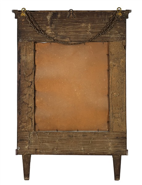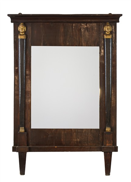 Piccola specchiera in legno tinto mogano con montanti ebanizzati e testa di erma in legno dorato. Secolo XIX (cm 101x72) (difetti e restauri)