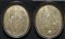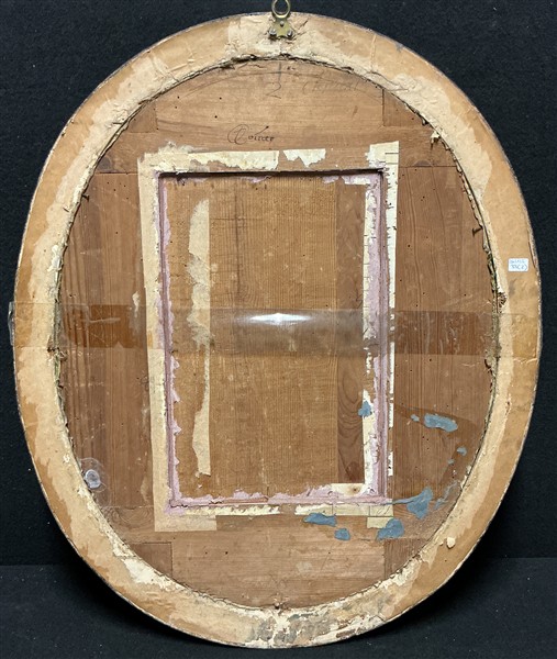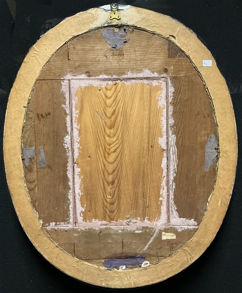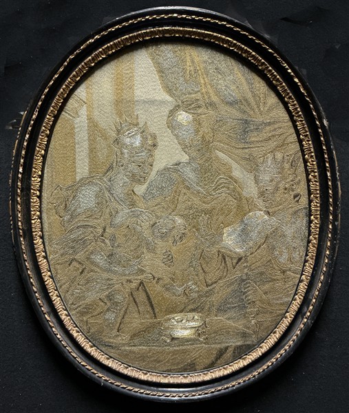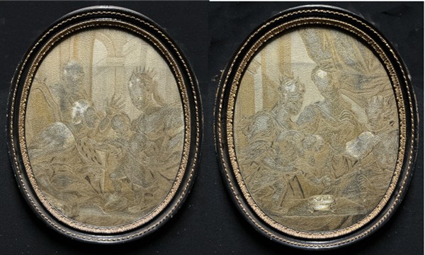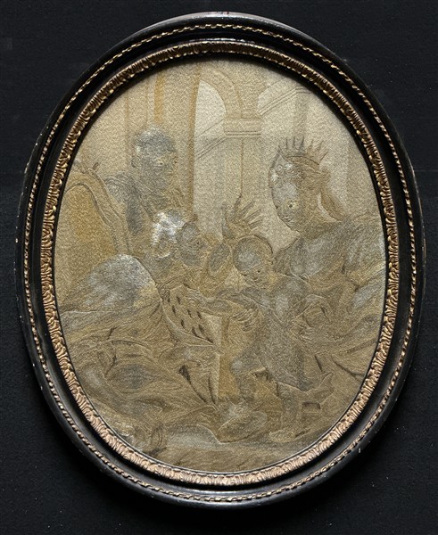 Manifattura del secolo XVIII. Coppia di ricami in seta a punto lanciato a due colori, oro e argento, raffiguranti scena allegorica (cm 60x48) In cornici ovali coeve in legno ebanizzato e dorato (lievi difetti)