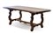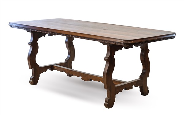 Tavolo fratino in legni vari con bordura unghiata, gambe sagomate raccordate da traversa (cm 223x83x93) (difetti)