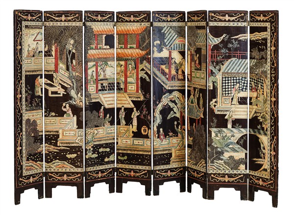 Lotto 1223 | Paravento a otto ante in legno scolpito con decoro floreale, rami fioriti e vol