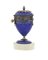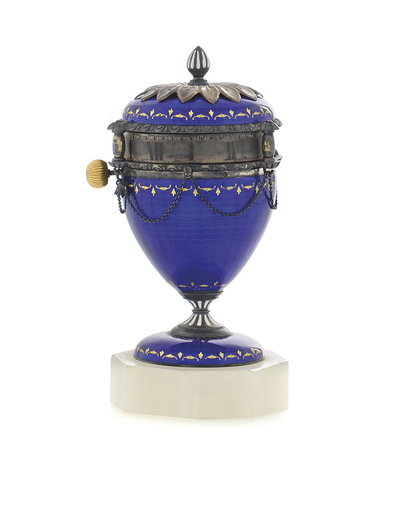 PICCOLO OROLOGIO IN ARGENTO E SMALTO GUILLOCHE' BLU, INIZIO XX SECOLO, ovoidale con movimento orizzontale su base in alabastro; danni e da revisionare.