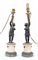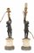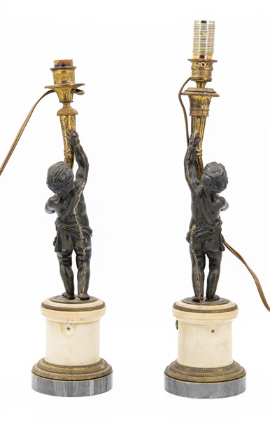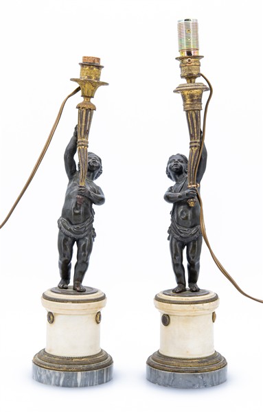 Coppia di candelieri in bronzo brunito e dorato con fusto a figura di putto reggente cornucopia, base a semicolonna in marmo bianco e marmo grigio. Secolo XIX. Adattati a luce elettrica in epoca successiva (h cm 41) (difetti)