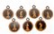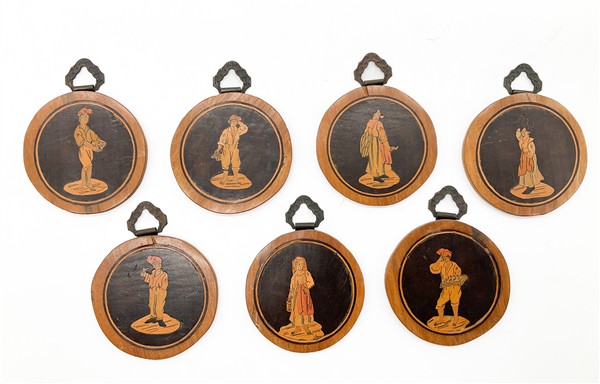 Manifattura sorrentina. Gruppo di sette piccole tarsie circolari in legni vari con figure popolari (d cm 6) (difetti)
