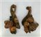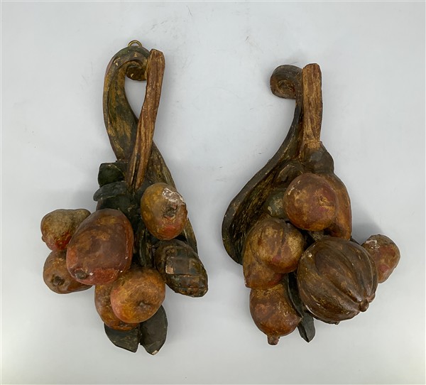 Coppia di fregi in legno intagliato e dipinto in policromia a frutti e pigne. Secolo XIX (h cm 42) (difetti)
