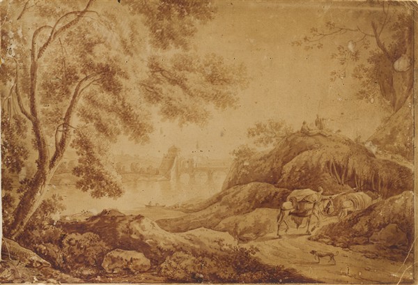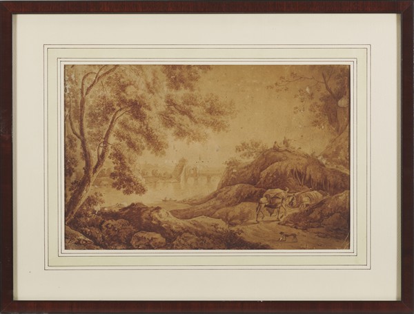 Artista del secolo XVIII "Pesaggio con figure in prossimità di un fiume" penne