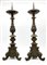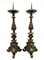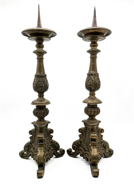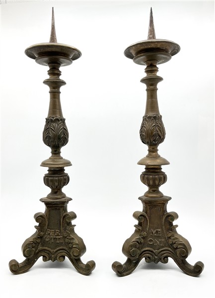 Coppia di portacero in bronzo con fusto tornito e decorato a foglie su base tripode a volute, iscrizioni con data 1721 a rilievo. Secolo XVIII (h cm 63) (lievi difetti)