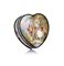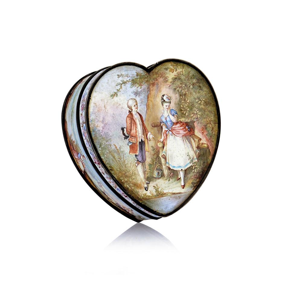 SCATOLA IN ARGENTO DECORATA A SMALTI, XIX SECOLO, a cuore con scene galanti entro paesaggio; lievi difetti.
