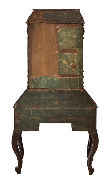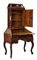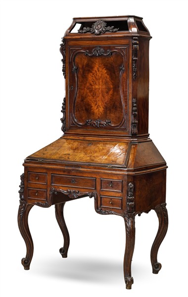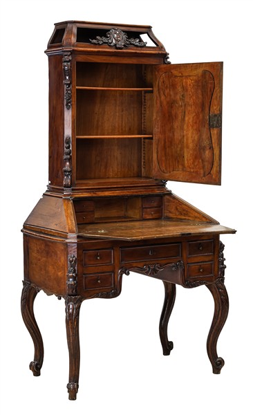 Piccolo trumeau in noce e radica di noce, parte inferiore a cinque diversi cassetti su alte gambe mosse e calatoia celante quattro tiretti e vano a giorno. Parte superiore ad un'anta con pannellatura sagomata e cappello a giorno con fregio intagliato. Secolo XIX (cm 94x180x54) (difetti)