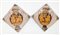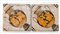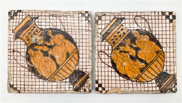 Manifattura di Napoli, secolo XIX. Coppia di piastrelle in maiolica dipinta in policromia a vaso biansato e istoriato su fondo quadrettato (cm cad. 20x20) (difetti)