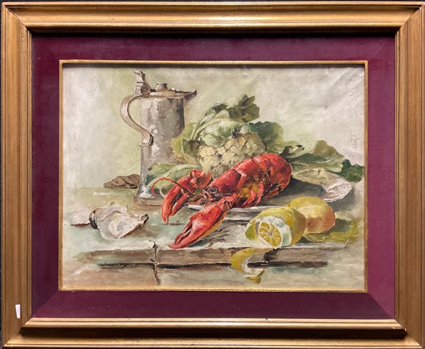 Ignoto del secolo XX "Composizione con aragosta, cavolfiore, ostriche e limone