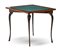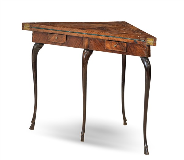Tavolo da gioco di forma triangolare impiallacciato in palissandro e filettato,