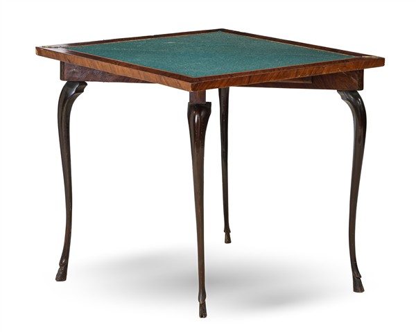 Tavolo da gioco di forma triangolare impiallacciato in palissandro e filettato, piano ribaltabile con riserva in panno verde e due tiretti nella fascia, gambe mosse terminanti a zoccolo in massello (cm chiuso 107x78x53) (difetti e piccole mancanze)
