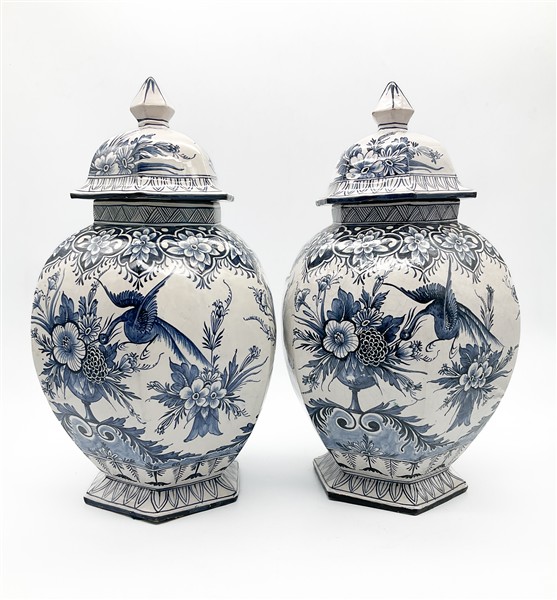 Manifattura di Delft. Coppia di potiche in ceramica dipinta in monocromo blu a fiori e volatili. Marcati sotto la base (h cm 45) (difetti e una con restauro al collo)