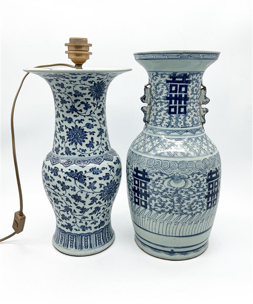 Lotto composto da due diversi vasi a balaustro in porcellana dipinta in monocromia blu con decori diversi. Cina, secolo XIX-XX (h. max cm 45) (difetti)