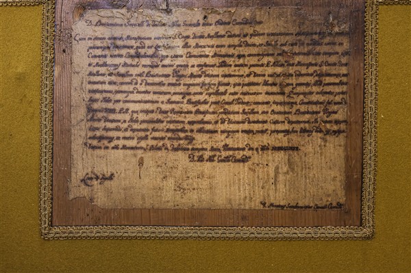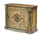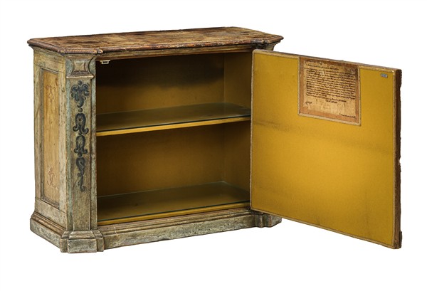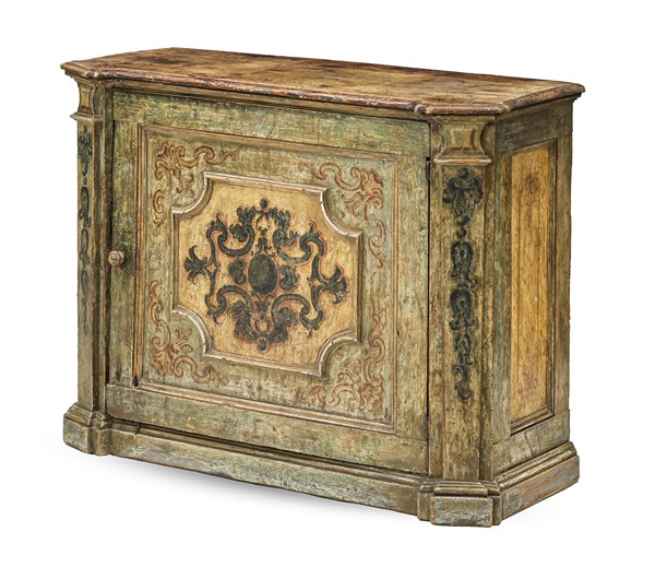 Antico stipo ad un'anta in legno dipinto e laccato decorato a motivi stilizzati e volute in policromia, montanti a lesena rastremata (cm 106x82x45) cartiglio con iscrizione datata 1780 incollato all'interno dell'anta (difetti)