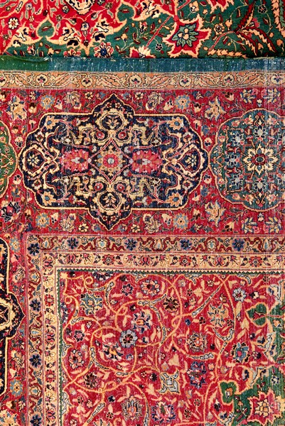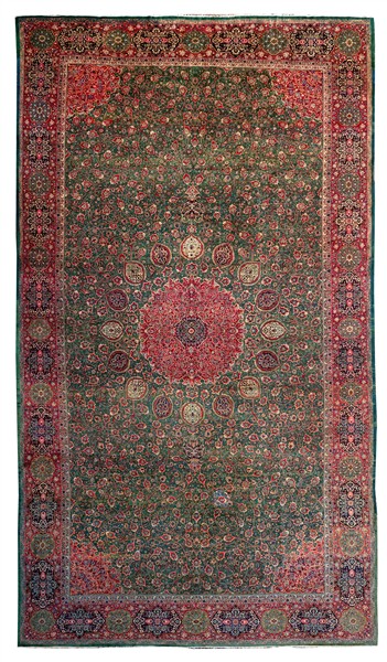 Tappeto Ardebil, Persia, secolo XX. Decoro ispirato al grande tappeto di Ardebil conservato al Victoria & Albert Museum di Londra. Campo color verde smeraldo ricco di abrash ornato da volute di ispirazione safavide con palmette e puntali, al centro un medaglione polilobato a fondo rosso dal cui perimetro escono riserve a forma di palmette a fondo bianco e blu alternate. Due puntali a forma di vaso biansato decorato con motivi floreali su fondo blu scuro, i quattro angolari sono a fondo rosso e decorati col medesimo motivo del medaglione. Grande bordura con cartigli a fondo blu e rosette a fondo verde su fondo colore rosso, una piccola bordura interna è decorata col motivo a nastri e nuvole di derivazione cinese (cm 835x456) (difetti, vecchi restauri, due piccole zone di sbavatura del rosso)